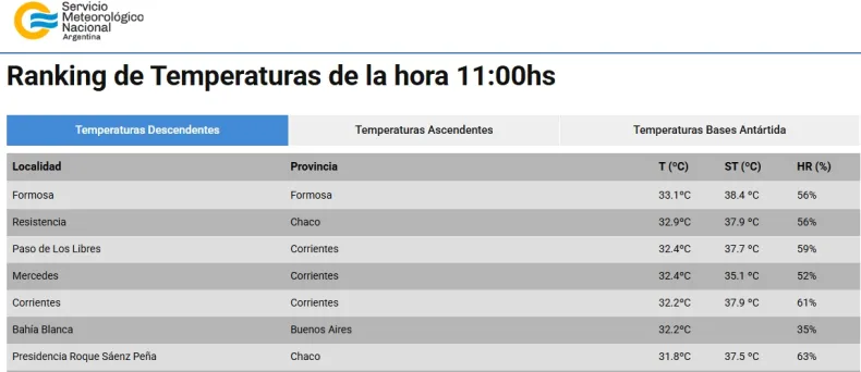 De acuerdo al relevamiento, la capital chaqueña registró una temperatura de 32,9°C, con una sensación térmica cercana a los 37,9°C y una humedad del 56%, posicionándose apenas por debajo de Formosa capital, que encabezó el listado con 33,1°C. Otras localidades como Roque Sáenz Peña estuvieron en el top 10, con 31.8ºC.