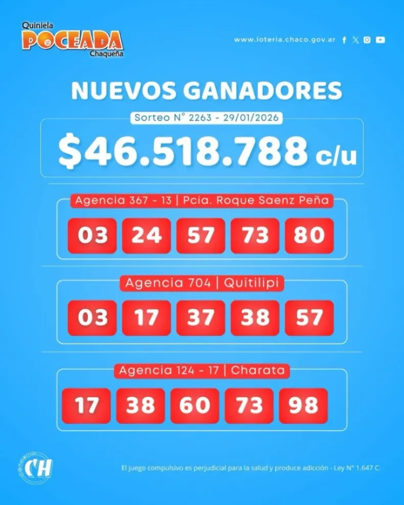 Las jugadas ganadoras se realizaron en las agencias 367-13 (Sáenz Peña), 704 (Quitilipi) y 124-17 (Charata), según los datos aportados por la entidad que organiza la lotería chaqueña.