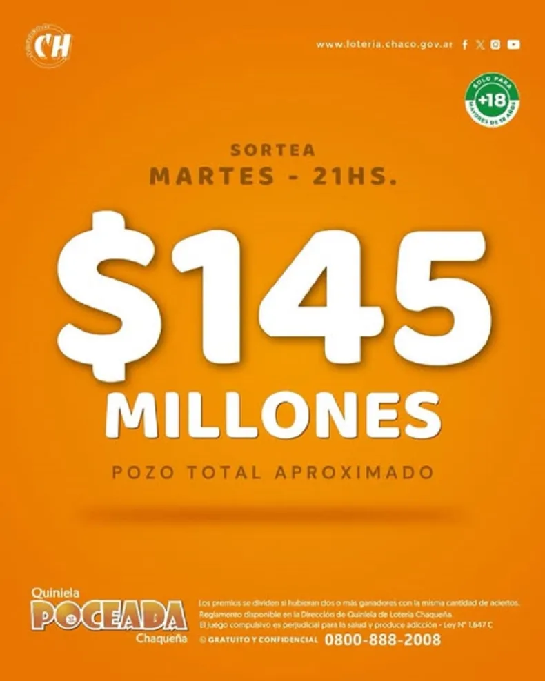 Este martes Lotería Chaqueña realizará el sorteo N°2265 de la Quiniela Poceada, poniendo en juego un pozo aproximado de $145.392.349,40. Como es habitual, el sorteo llevará adelante a las 21.