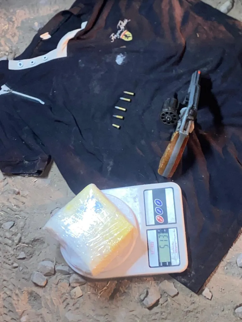 En su interior se hallaron 513 gramos de cocaína de máxima pureza, envueltos en cinta de embalar amarilla, un revólver calibre 22 con cartuchos y una vaina servida.