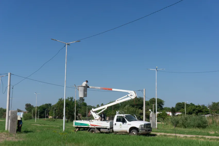 Las tareas incluyen el recambio de cables existentes por nuevos, con una instalación aérea, y la colocación de equipos LED que permiten la repotenciación integral del sistema de iluminación. Además, se está trabajando en los tableros eléctricos, donde se realiza el cambio de contactores y llaves térmicas, mejorando el sistema de encendido y la protección de toda la red.