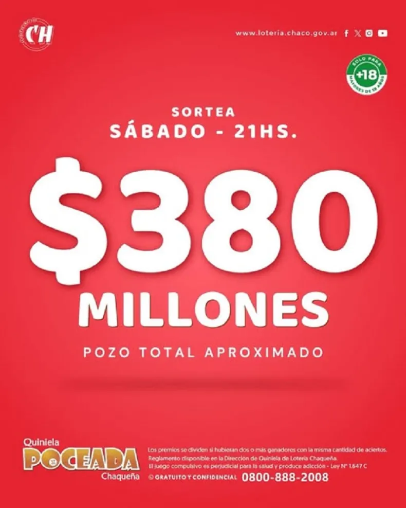 El pasado jueves, la Quiniela Poceada quedó vacante por tercera vez consecutiva. Este sábado Lotería Chaqueña realizará el sorteo N°2267 donde pondrá en juego un pozo de $380.009.186,08.