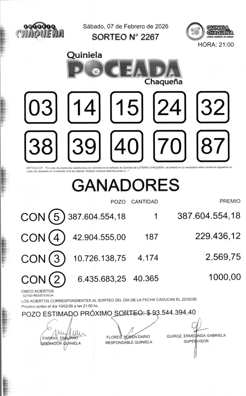 La fortuna sonrió fuerte este fin de semana en la capital chaqueña. Un apostador de Resistencia se convirtió en nuevo ganador de la Poceada al quedarse con un pozo superior a los $ 387 millones tras acertar los cinco números del sorteo.