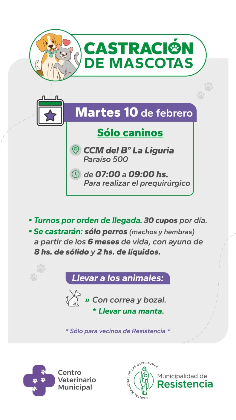 Esta semana los operativos de castraciones de mascotas continuarán en Resistencia, puntualmente en el barrio La Liguria. La atención tiene cupo limitado y es sin costo para vecinos de la ciudad.