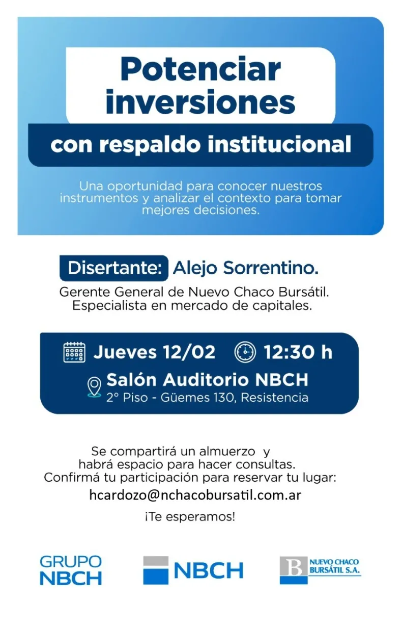La empresa brindará una charla para inversores y clientes con análisis de contexto y opciones del mercado. Será el jueves 12 en el Nuevo Banco Chaco.