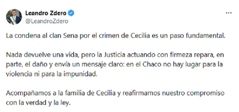 Por último, Zdero agregó: "Acompañamos a la familia de Cecilia y reafirmamos nuestro compromiso con la verdad y la ley".