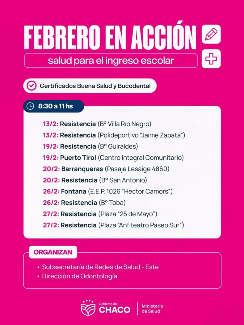 "Promovemos un cuidado efectivo de la salud de los chaqueños, acompañando a las familias en un momento clave del año como es el inicio del ciclo escolar", señalaron desde el Ministerio.
