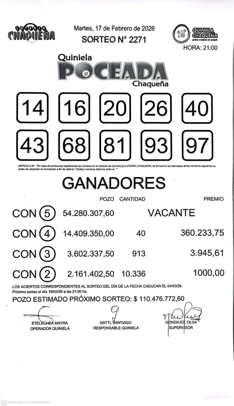Este martes, Lotería Chaqueña llevó adelante el sorteo N°2271 de la Quiniela Poceada. Ningún apostador en la provincia logró los cinco aciertos, por lo que el pozo superior a los 54 millones de pesos quedó vacante. Para su próxima edición, acumula un pozo de 110 millones de pesos.