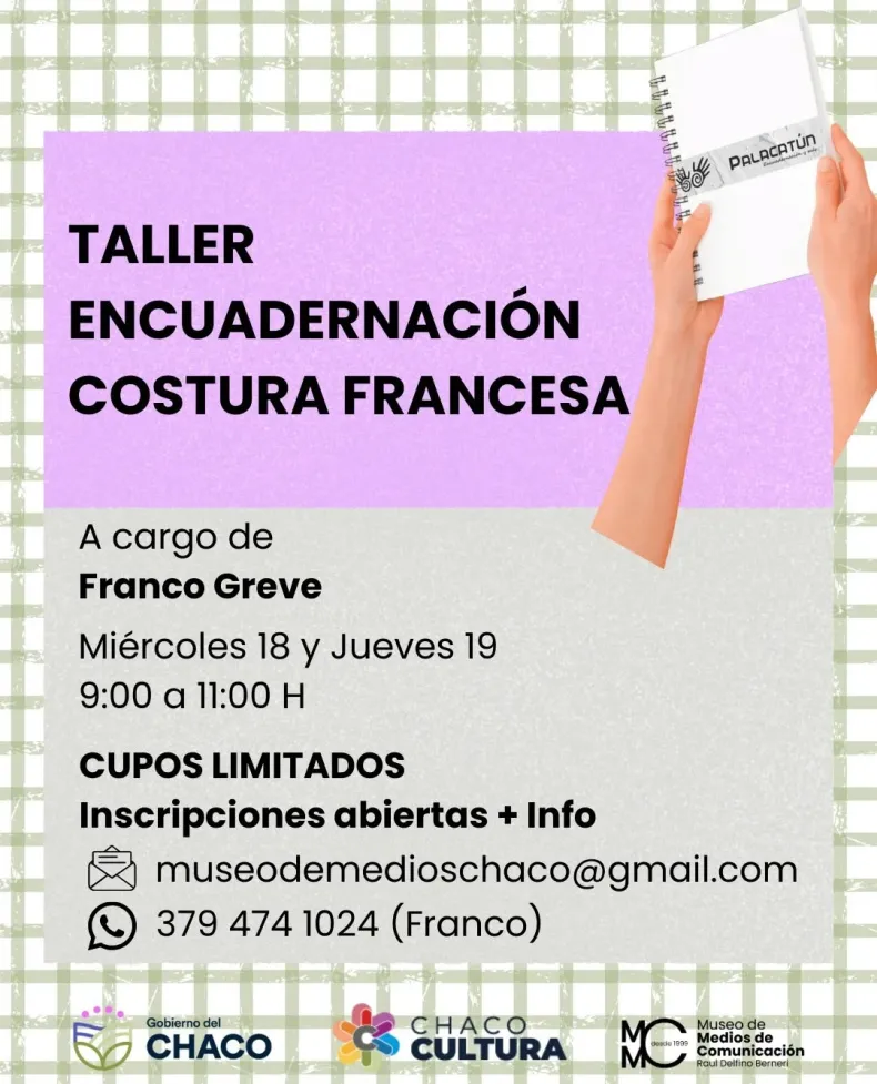 Este miércoles 18 y jueves 19 en el Museo de Medios -ubicado en Pellegrini 213- habrá un taller de encuadernación artesanal. La actividad estará a cargo del profesor Franco Greve y no requiere experiencia previa. Será de 9 a 11 en ambos días, con cupos limitados. Cada participante realiza su propio cuaderno y se lo lleva terminado. Para consultas e inscripciones, las personas interesadas pueden comunicarse al 3794741024.