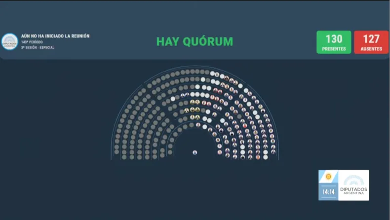 A las 14.14, Martín Menen, presidente de la Cámara de Diputados de la Nación, señaló que había quórum y dio inicio formal a la sesión. Esto fue posible gracias al acompañamiento de varias fuerzas a La Libertad Avanza, entre ellas, el PRO, la UCR, el MID, además de fuerzas provinciales.