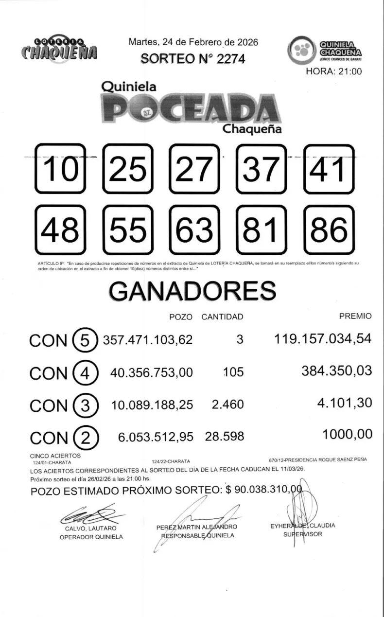 De acuerdo a los datos oficiales de Lotería Chaqueña, el pozo de cinco aciertos alcanzó los $ 357.471.103,62, que se distribuyó entre tres ganadores, quienes cobrarán $ 119.157.034,54 cada uno. Uno de los boletos premiados fue registrado en la localidad de Charata.