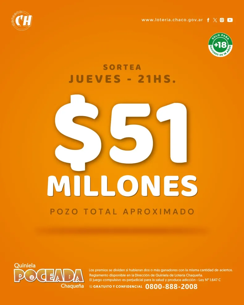El próximo sorteo, que tendrá lugar el jueves 5 a las 21, pondrá en juego un pozo aproximado de $51.121.085,50, según informó Lotería Chaqueña.