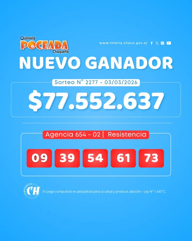 En el Sorteo N°2277 de la Quiniela Poceada, realizado este martes, un afortunado logró los cinco aciertos y se llevó el premio mayor: $77.552.637. La jugada ganadora fue en la ciudad de Resistencia.