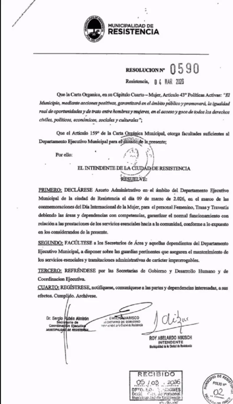 A través de la Resolución 590, la Municipalidad de Resistencia declaró asueto administrativo para mujeres y personas trans para el día lunes 9 de marzo, en el marco de la conmemoración del Día Internacional de la Mujer.