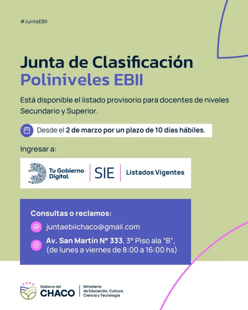 Además, quienes prefieran realizar consultas de manera presencial podrán hacerlo en la sede de la Junta de Clasificación, ubicada en avenida San Martín 333, tercer piso, ala "B" , en la ciudad de Resistencia, de lunes a viernes de 8 a 16.
