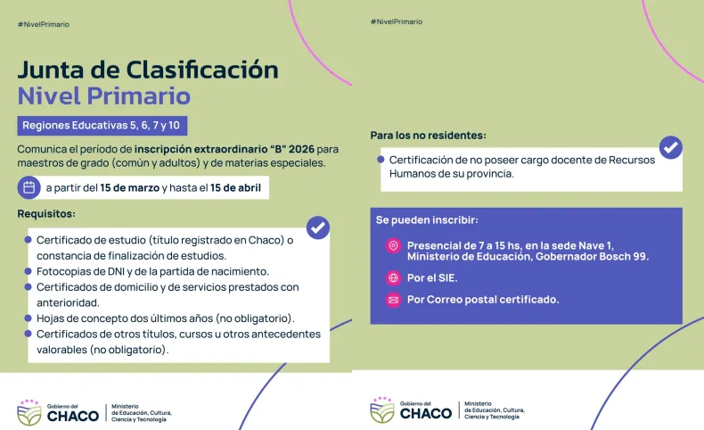 La convocatoria, organizada por la Junta de Clasificación de Nivel Primario de las Regiones Educativas 5, 6, 7 y 10, con sede en Resistencia, estará habilitada desde el 15 de marzo hasta el 15 de abril.