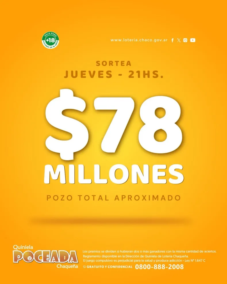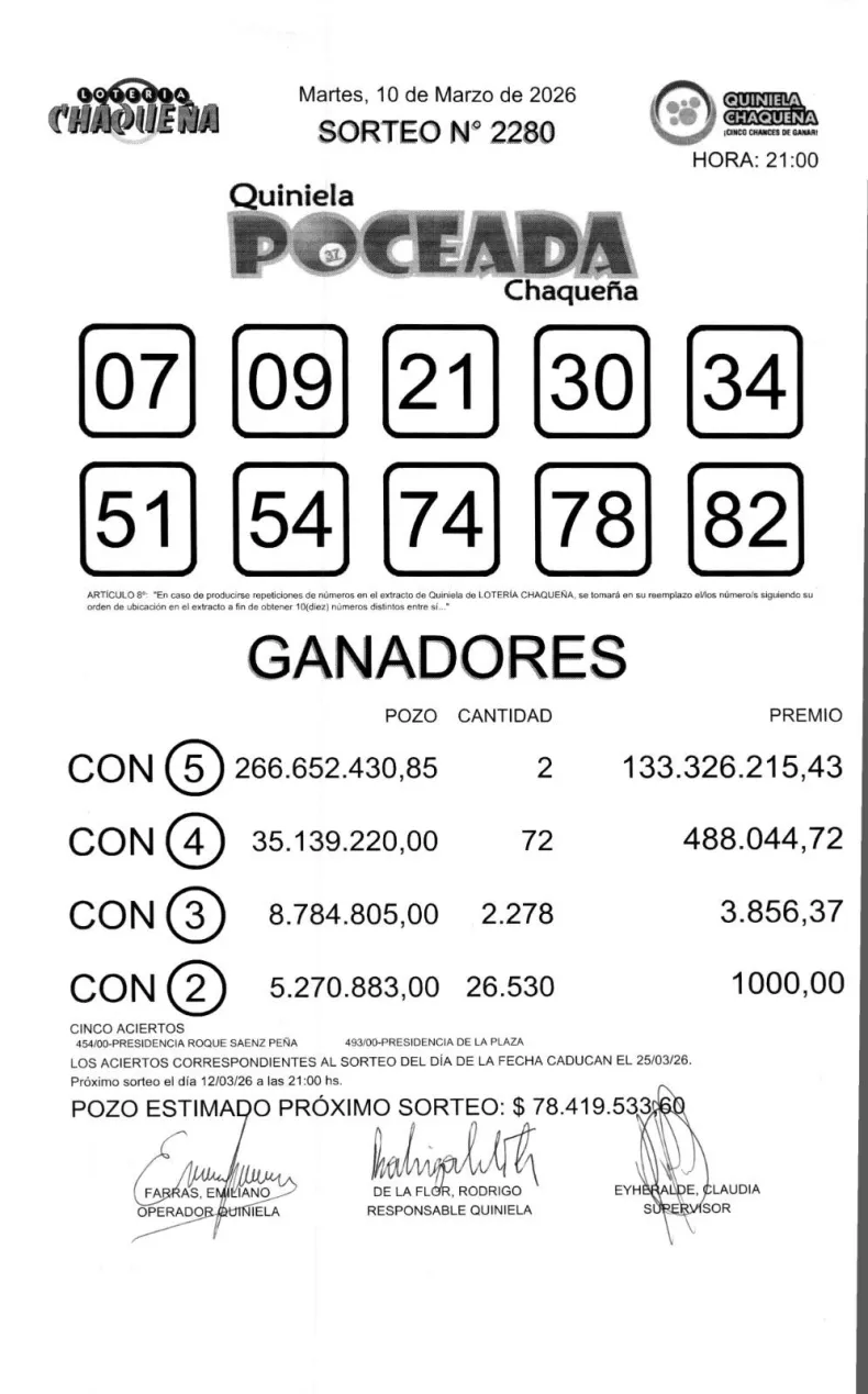 Desde Lotería Chaqueña también informaron que el pozo estimado para el próximo sorteo, previsto para el 12 de marzo, asciende a $ 78.419.533,60.