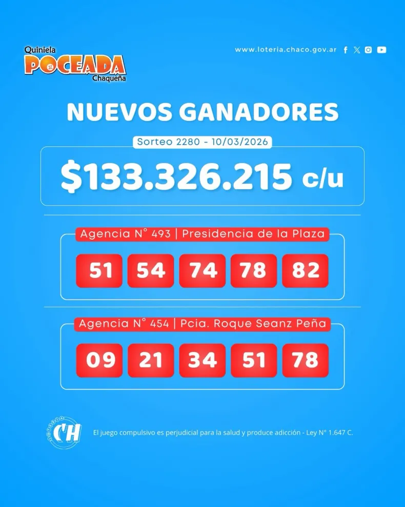 Según informó Lotería Chaqueña, las jugadas ganadoras fueron registradas en la Agencia N° 493 de Presidencia de la Plaza y en la Agencia N° 454 de Presidencia Roque Sáenz Peña.
