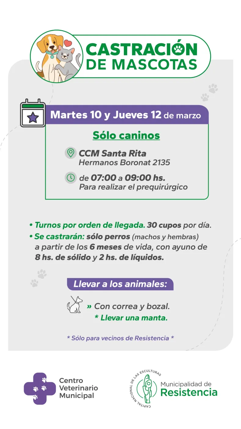 En esta oportunidad, se castrará solo a caninos, machos y hembras, a partir de los 6 meses de vida. Los animales deben cumplir con un ayuno de 8 horas de sólidos y 2 horas de líquidos.