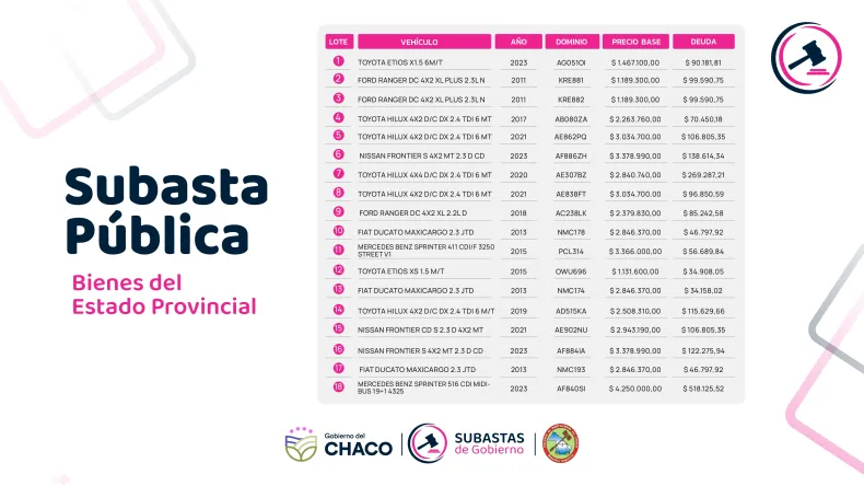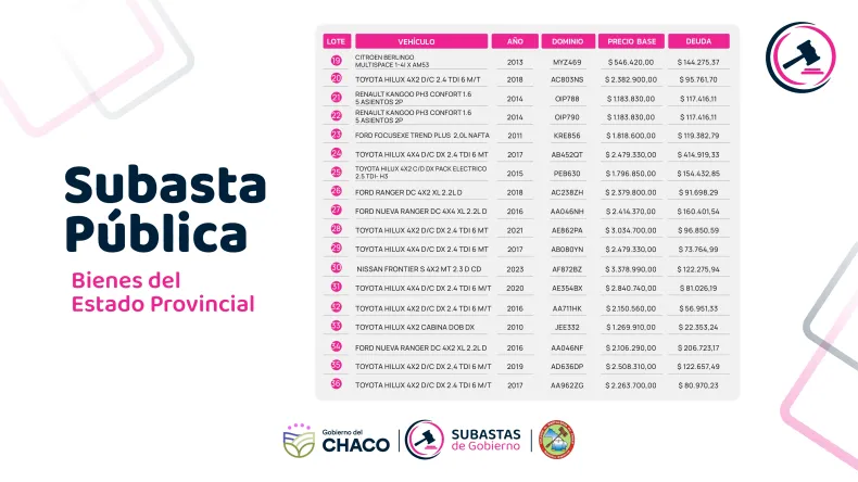 El Gobierno realizará el lunes 30 de marzo la sexta subasta provincial de bienes en desuso, donde se pondrán a la venta 36 vehículos pertenecientes al Estado provincial. El remate se llevará a cabo en el CEF N°1 "Miguel Ángel Campos" de Resistencia, con acreditación desde las 8 de la mañana.