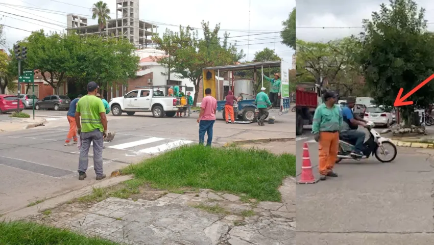 En el lugar se dispusieron conos para señalizar un desvío y evitar la circulación vehicular, pero varios motociclistas no respetan las indicaciones y optan por cruzar por la vereda, generando malestar entre vecinos y trabajadores.