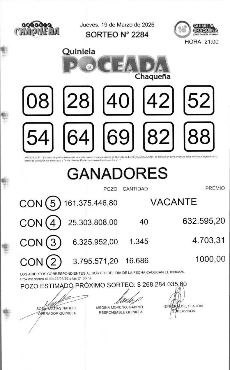 La Poceada Chaqueña realizó este jueves 19 de marzo su sorteo N° 2284, sin que se registraran ganadores en la categoría principal, por lo que el pozo acumulado continúa creciendo y genera expectativa para la próxima jugada.