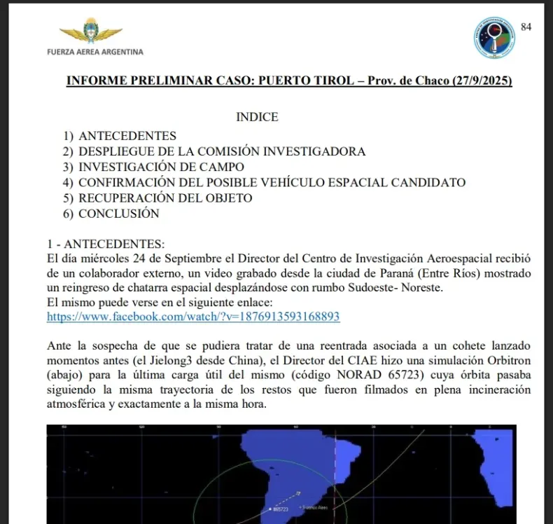 Un informe del Centro de Investigación Aeroespacial (CIAE) reveló que el objeto hallado en septiembre de 2025 en Campo Rossi, pertenecía a un cohete chino. El documento forma parte del reporte anual del organismo sobre avistamientos de objetos no identificados.