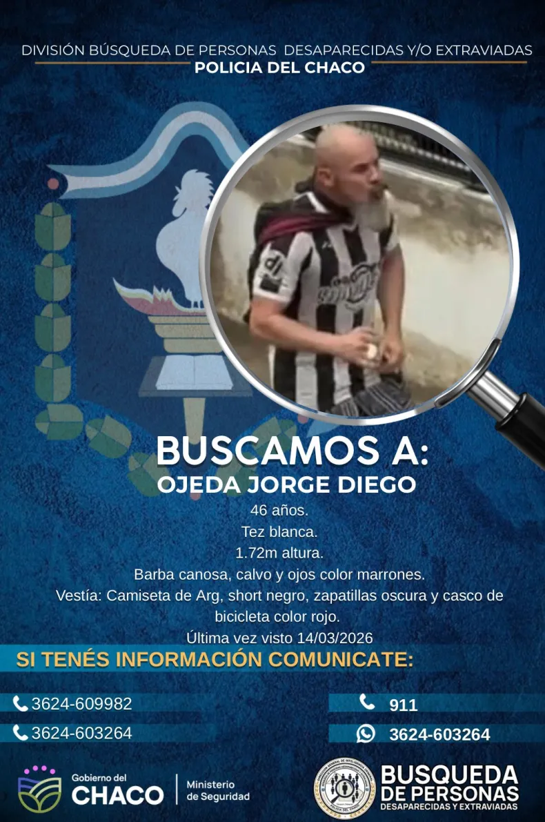 La Policía del Chaco activó un pedido de paradero para Jorge Diego Ojeda, de 46 años, quien fue visto por última vez el pasado viernes 13 de marzo en una vivienda ubicada sobre calle Obligado al 1700, en la ciudad de Resistencia.