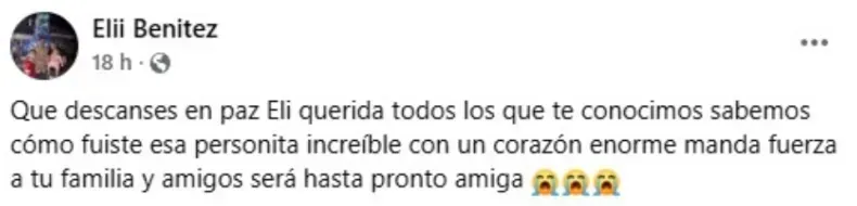 En distintos mensajes también se destacó su personalidad y el vínculo cercano que mantenía con su entorno. "Que descanses en paz. Eli querida, todos los que te conocimos sabemos cómo fuiste: una personita increíble, con un corazón enorme", señalaron.