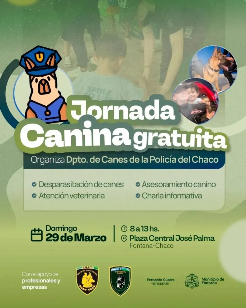 El Departamento de Canes de la Policía del Chaco realizará este domingo 29 de marzo una jornada canina gratuita en la ciudad de Fontana, destinada a promover el cuidado responsable de mascotas y facilitar el acceso a servicios básicos de salud animal.