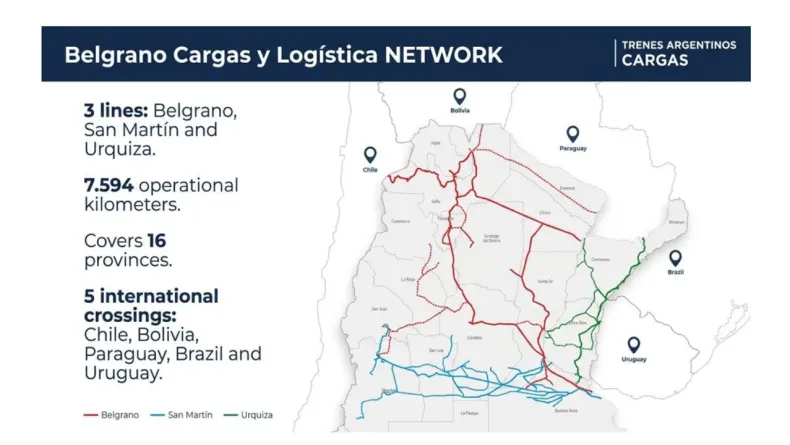 La red ferroviaria involucrada abarca 7.594 kilómetros operativos correspondientes a las líneas Belgrano, San Martín y Urquiza, atravesando 16 provincias y conectando con cinco pasos internacionales.