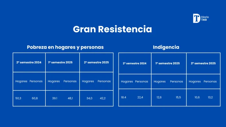 En el caso de la pobreza, el aglomerado chaqueño registró una fuerte caída desde el 60% en el segundo semestre de 2024 al 48,1% en el primer semestre de 2025. La tendencia descendente continuó en la segunda mitad de ese año, cuando el índice se ubicó en el 42,2%, consolidando una baja de casi 18 puntos porcentuales en doce meses.