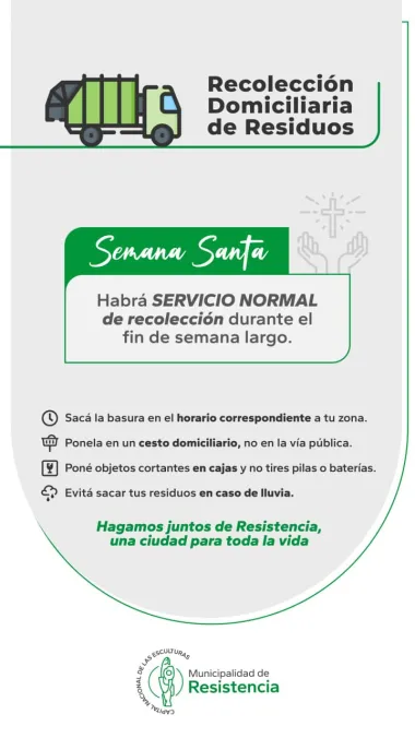 En este marco, anunciaron que la recolección de residuos será normal durante estos días, manteniendo los horarios habituales en las distintas zonas.