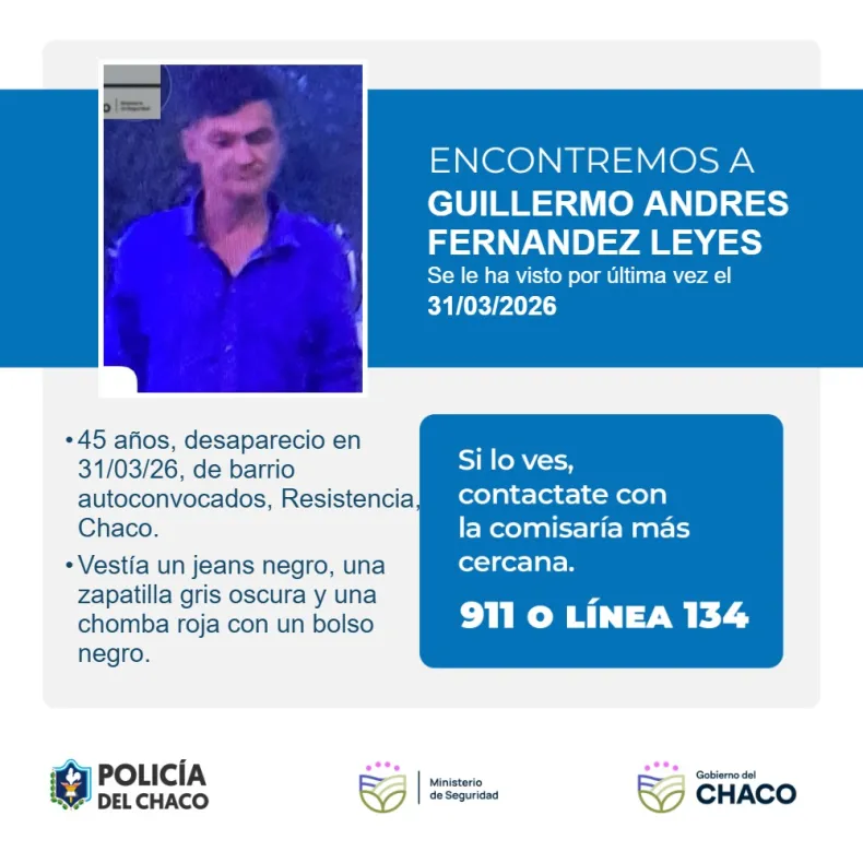 La Policía del Chaco solicita la colaboración de la comunidad para dar con el paradero de Guillermo Andrés Fernández Leyes, un hombre de 45 años que fue visto por última vez el pasado 31 de marzo en el barrio Autoconvocados de la ciudad de Resistencia.