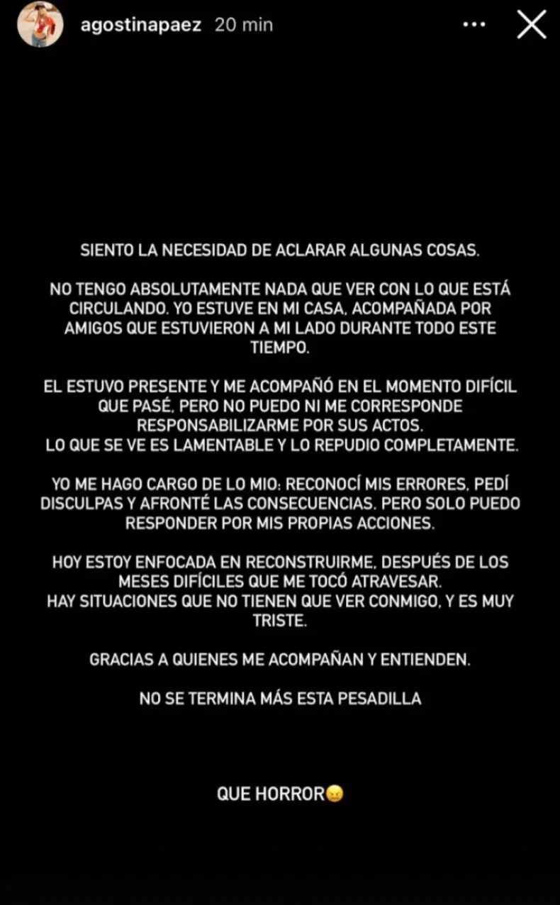 Tras la difusión del material, Agostina publicó un mensaje en su cuenta de Instagram para despegarse de lo ocurrido. "Siento la necesidad de aclarar algunas cosas. No tengo absolutamente nada que ver con lo que está circulando. Yo estuve en mi casa acompañada por amigos que estuvieron a mi lado todo este tiempo. Él estuvo presente y me acompañó en el momento difícil que pasé. No puedo ni me corresponde responsabilizarme por sus actos", escribió.