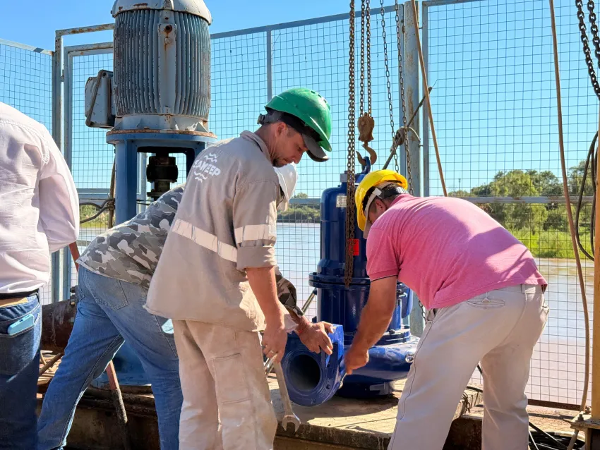 Este sábado, el gobernador Leandro Zdero supervisó la instalación de una nueva bomba en la planta potabilizadora ubicada en el Puente Libertad, que permitirá mejorar el servicio de agua potable en la localidad de General San Martín. Acompañaron al mandatario el ministro de Infraestructura, Hugo Domínguez, y autoridades de SAMEEP.
