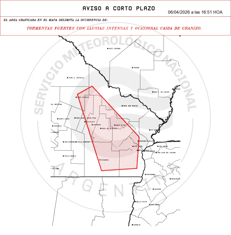 El Servicio Meteorológico Nacional emitió un comunicado a corto plazo donde advierte que, en gran parte de la provincia habrá tormentas fuertes con lluvias intensas y una ocasional caída de granizo.