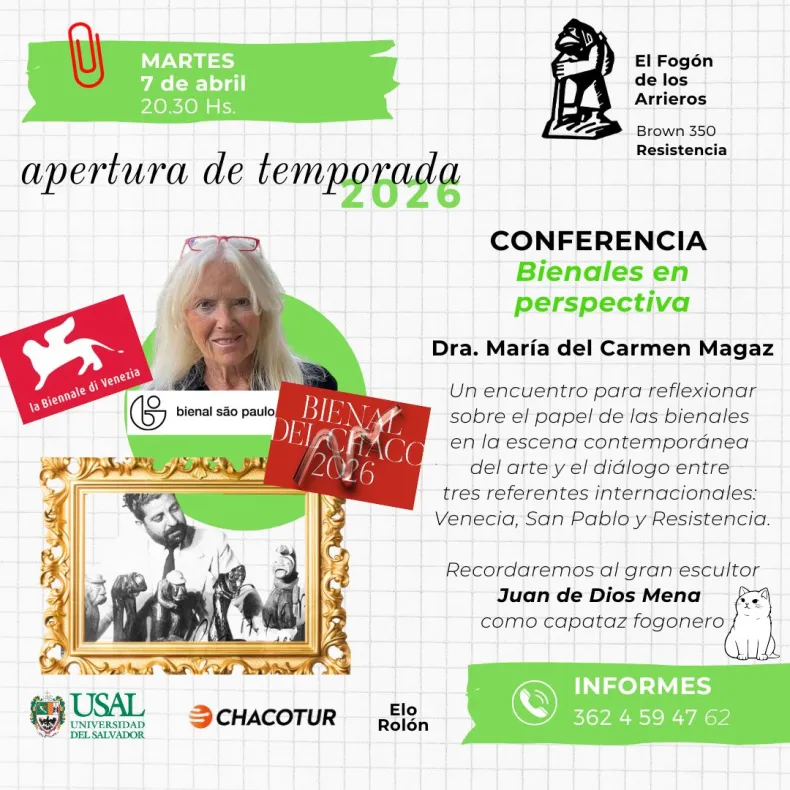La ciudad de Resistencia dará inicio a su temporada cultural este martes 7 de abril, desde las 20.30, con la conferencia "Bienales en perspectiva. Venecia, San Pablo y Chaco", a cargo de la Dra. María del Carmen Magaz.
