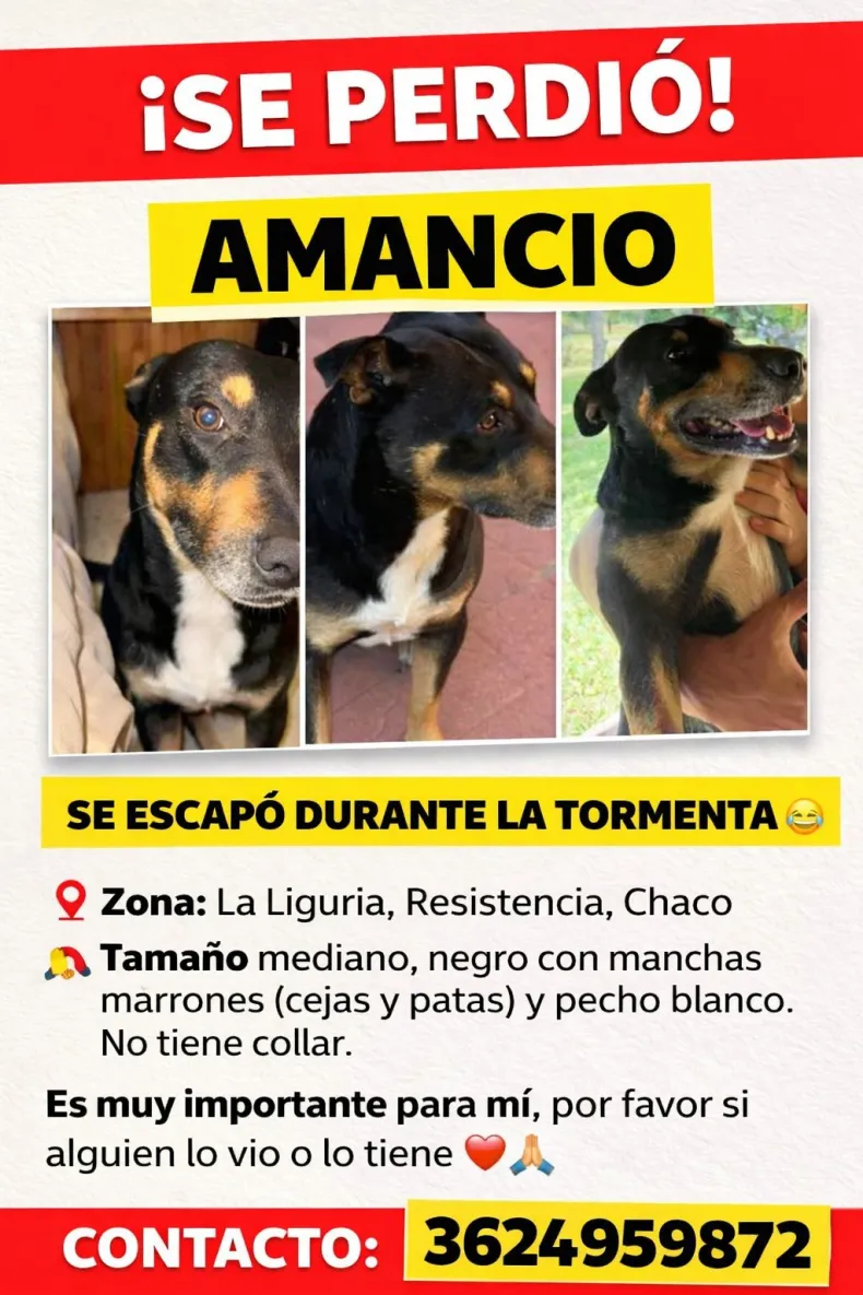 Además, detallaron que Amancio tiene 4 años y que viven a metros de la avenida 9 de Julio, sobre calle Agrimensor Seelstrang. Indicaron que el perro tiene miedo a los truenos y a los cohetes, motivo por el cual ya se había escapado en Año Nuevo.