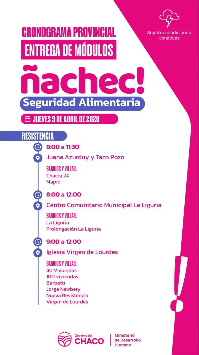 El Gobierno provincial, a través del programa Ñachec y en el marco de las políticas de seguridad alimentaria, llevará adelante este jueves 9 de abril una nueva jornada de entrega de módulos alimentarios en distintos puntos de la ciudad de Resistencia.