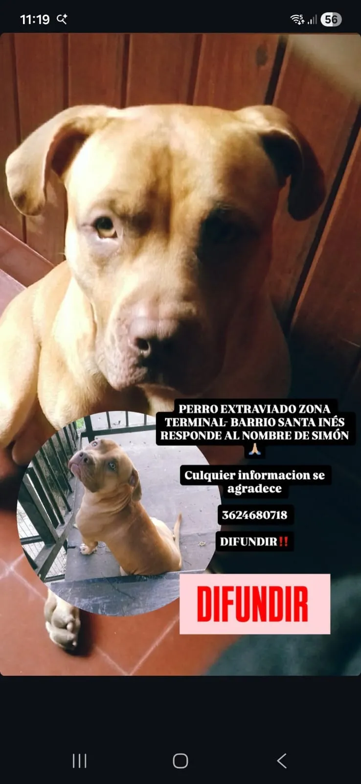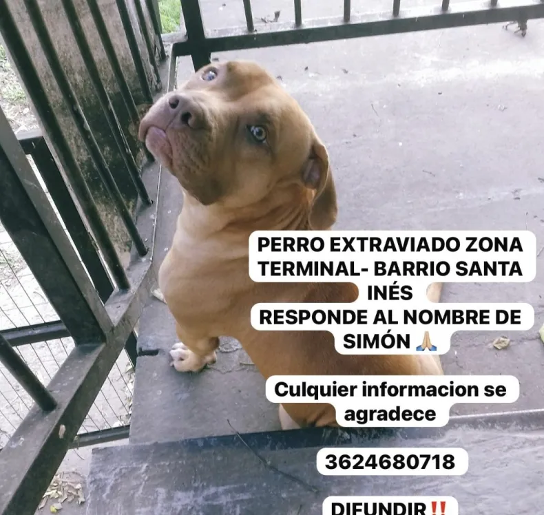 Según informaron, el animal responde al nombre de Simón y tiene una fisonomía similar a la de un pitbull, de color marrón, lo que podría facilitar su identificación.