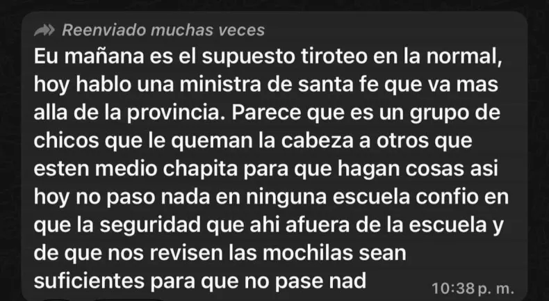 El texto viral expresa: "Eu mañana es el supuesto tiroteo en la normal, hoy hablo una ministra de Santa Fe que va más allá de la provincia. Parece que es un grupo de chicos que le queman la cabeza a otros que estén medio chapita para que hagan cosas así. Hoy no pasó nada en ninguna escuela confío en que la seguridad que ahí afuera de la escuela y de que nos revisen las mochilas sean suficientes para que no pase nada".