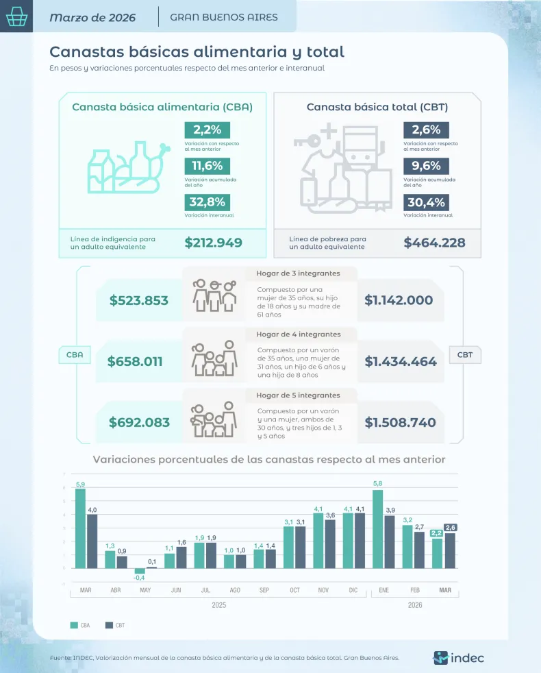 En el caso de la CBT, llegó al 2,6% en marzo, lleva un 9,6% en lo que va del año y registra un interanual del 30,4%.Una familia tipo (cuatro integrantes) precisó $ 1.434.464 para no ser pobre, mientras que, un hogar de tres integrantes necesitó $ 1.142.000 y una de cinco, $ 1.508.740.