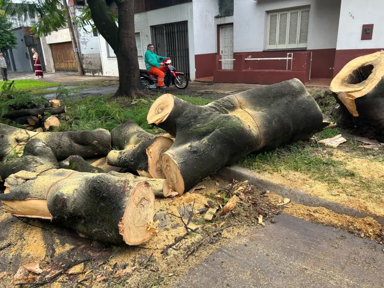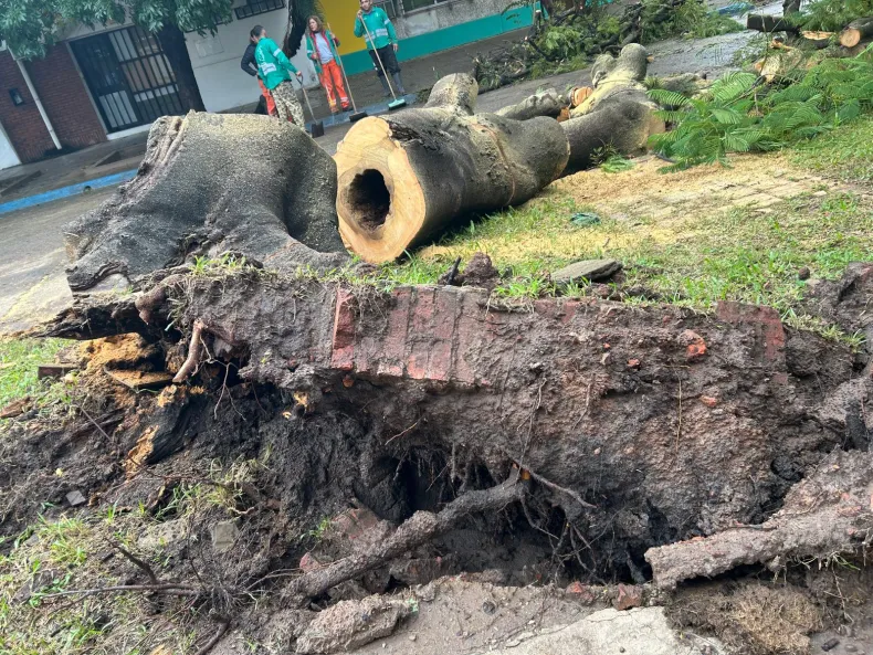 Además, se llevan adelante tareas de limpieza y desmalezado debido a la gran cantidad de ramas y restos que quedaron esparcidos sobre la vía pública. Pese al impacto, vecinos de la zona señalaron que no se registraron ingresos de agua en las viviendas, aunque sí se pudo observar cómo la raíz del árbol cedió por completo.