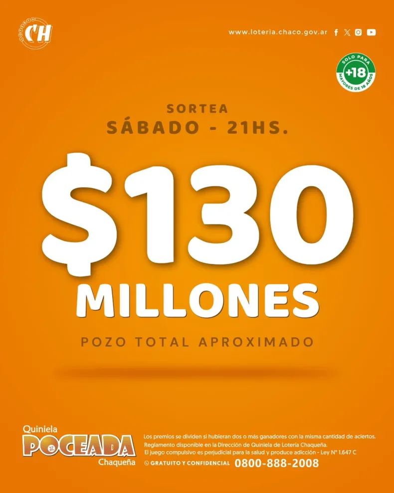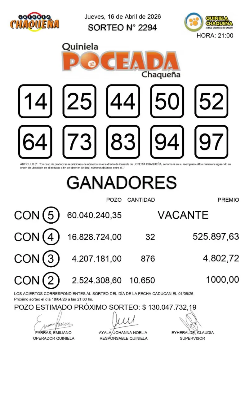 La Quiniela Poceada Chaqueña volvió a quedar vacante en su premio mayor tras el sorteo N° 2294 realizado este jueves 16 de abril, lo que genera gran expectativa de cara al próximo juego, cuyo pozo estimado superará los $ 130 millones.