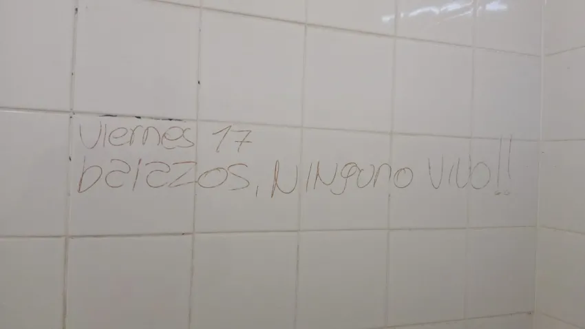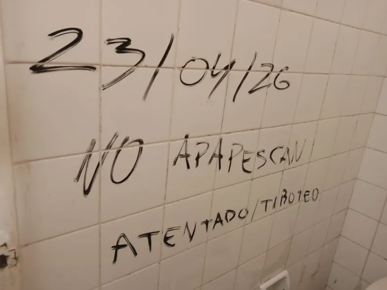 A partir de esa secuencia, distintos colegios de la provincia amanecieron con alertas por disparos. En esta ocasión, el primero de ellos fue en la Escuela Técnica N° 22 de Sáenz Peña, donde las paredes de los baños y los pizarrones estaban escritas con frases como: "Se va a armar la tiroteada" y "23/04/2026 no aparezcan atentado/tiroteo".