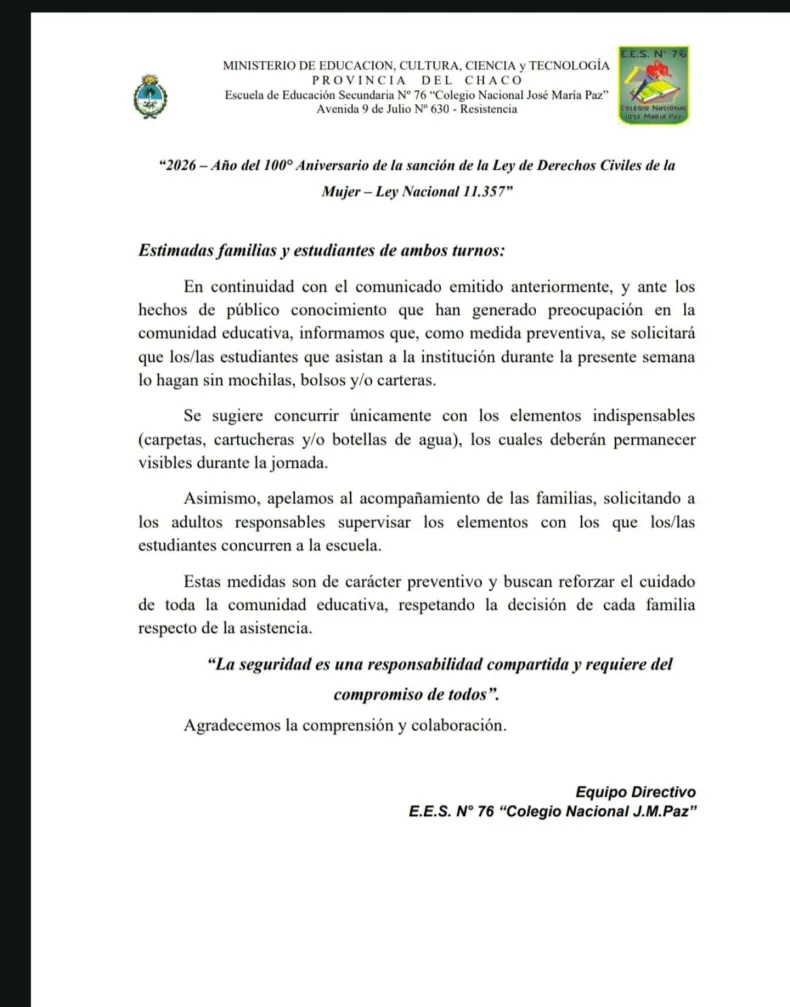 La comunidad educativa de la E.E.S. Nº 76 Colegio Nacional José María Paz fue informada sobre una serie de medidas excepcionales que regirán durante la presente semana, en el marco de acciones preventivas ante amenazas de tiroteo. A través de un comunicado oficial dirigido a familias y estudiantes, el equipo directivo solicitó que los alumnos asistan a clases sin mochilas, bolsos ni carteras.