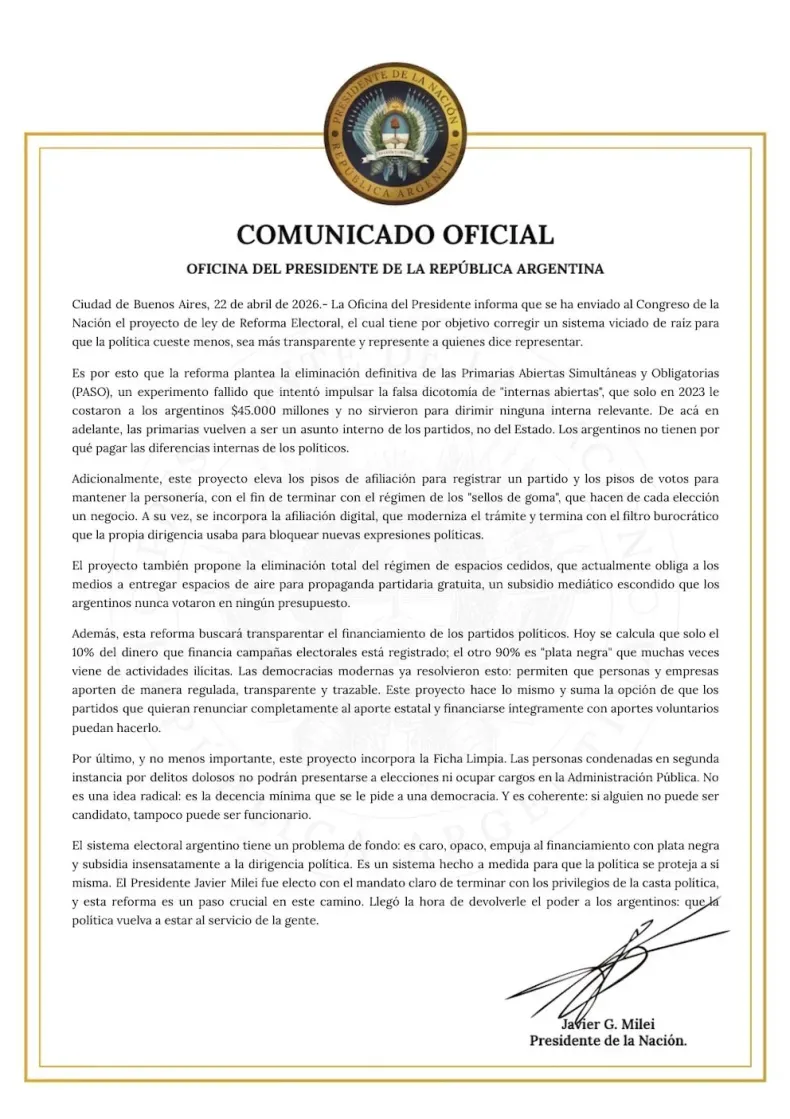 El Gobierno nacional envió al Congreso un proyecto de reforma electoral que propone eliminar las Primarias Abiertas, Simultáneas y Obligatorias (PASO) y modificar de manera integral el funcionamiento de los partidos políticos.