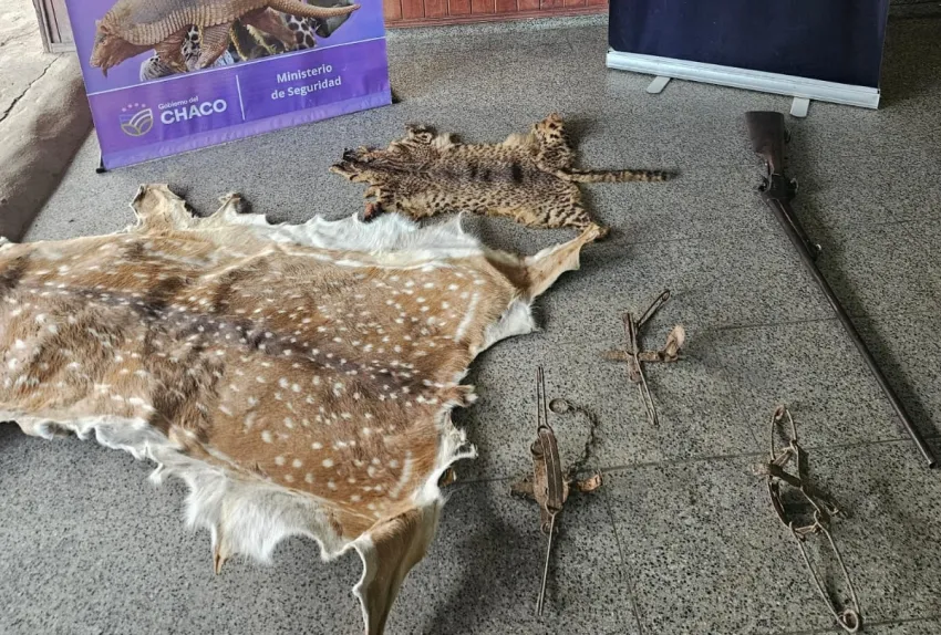 Asimismo, y en el marco de una infracción a la Ley de Caza, se incautaron cueros de fauna silvestre, correspondientes a un ciervo axis y un gato montés, además de tres trampas de hierro utilizadas para la caza ilegal.
