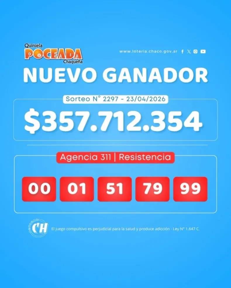 La fortuna volvió a sonreír en la capital chaqueña. Un apostador de Resistencia se convirtió en el nuevo gran ganador de la Poceada Chaqueña, al acertar los cinco números del sorteo y quedarse con un premio superior a los $357 millones.